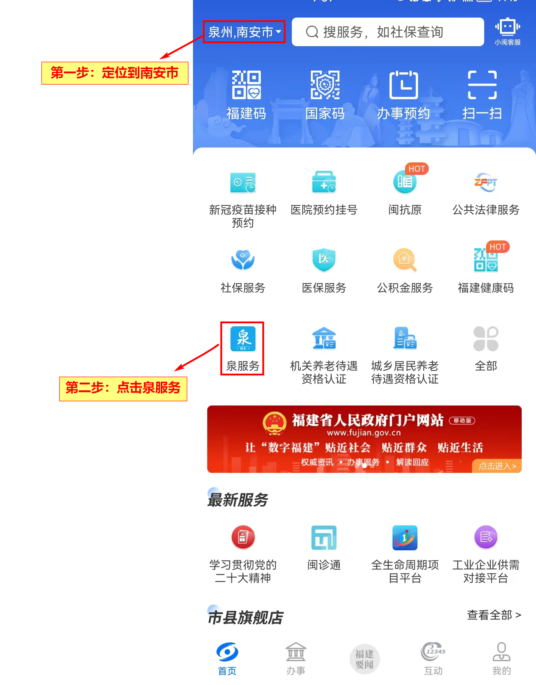 打开闽政通APP,①定位选择【泉州南安市】,②点击【泉服务】。