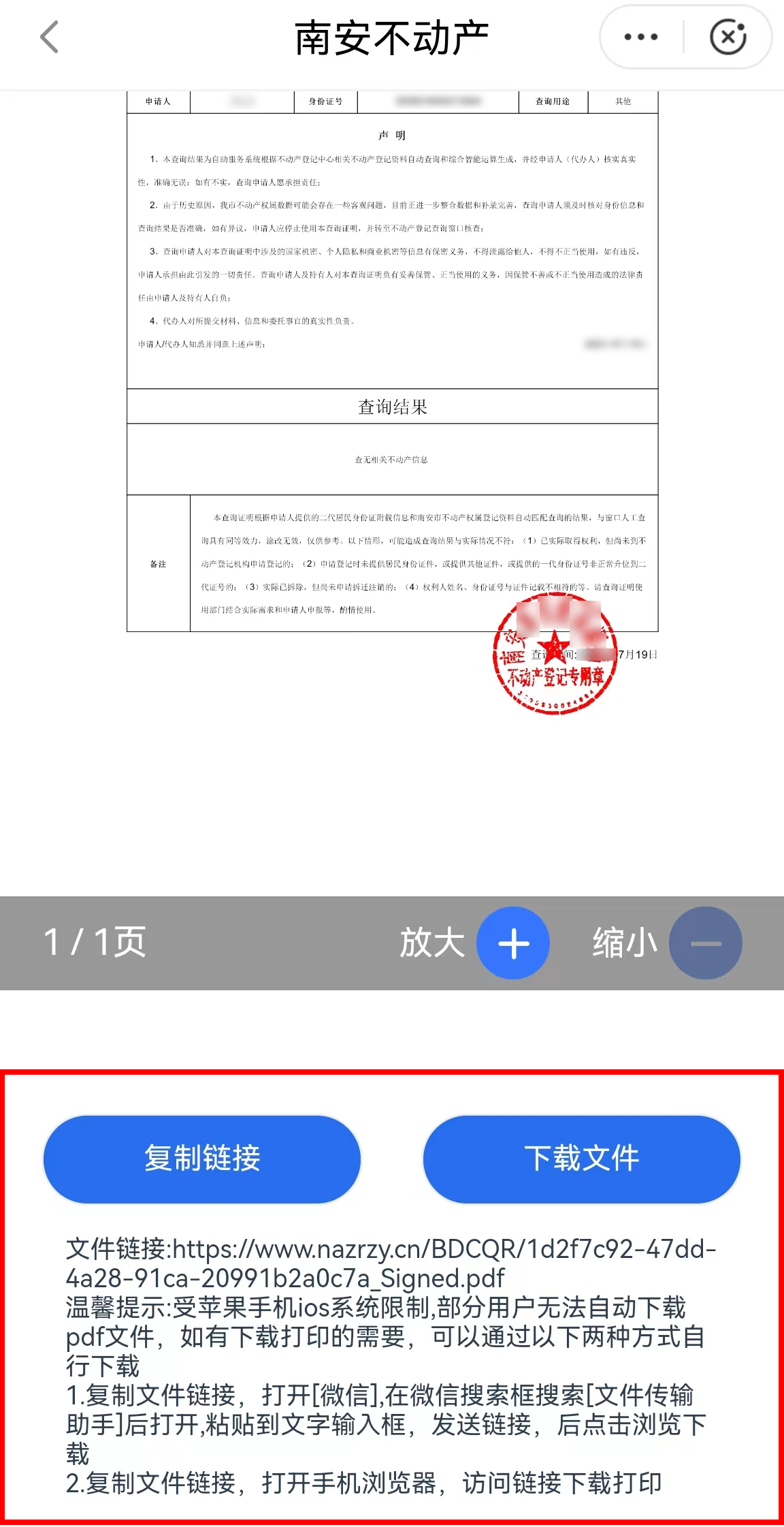 第六步:根据“个人不动产登记信息查询结果”页面下方下载步骤获取下载后的文件,并根据页面提示自行打印。